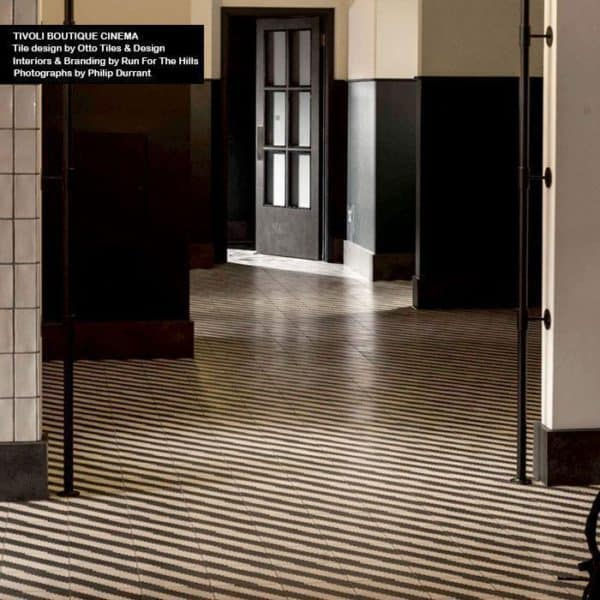 Galata Breeze Encaustic Cement Tile. These striking handmade cement tiles have a bold black and white stripe design. However, the borders of the lines are not straight, they are gently undulating zigzags, which create a feeling of motion and freedom. When laid, these arresting Turkish tiles form rows of interlocking black and white peaked pyramids.